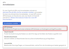 Weiteres muss unter „Anmeldedaten erstellen“ der Punkt „API-Schlüssel“ ausgewählt werden.